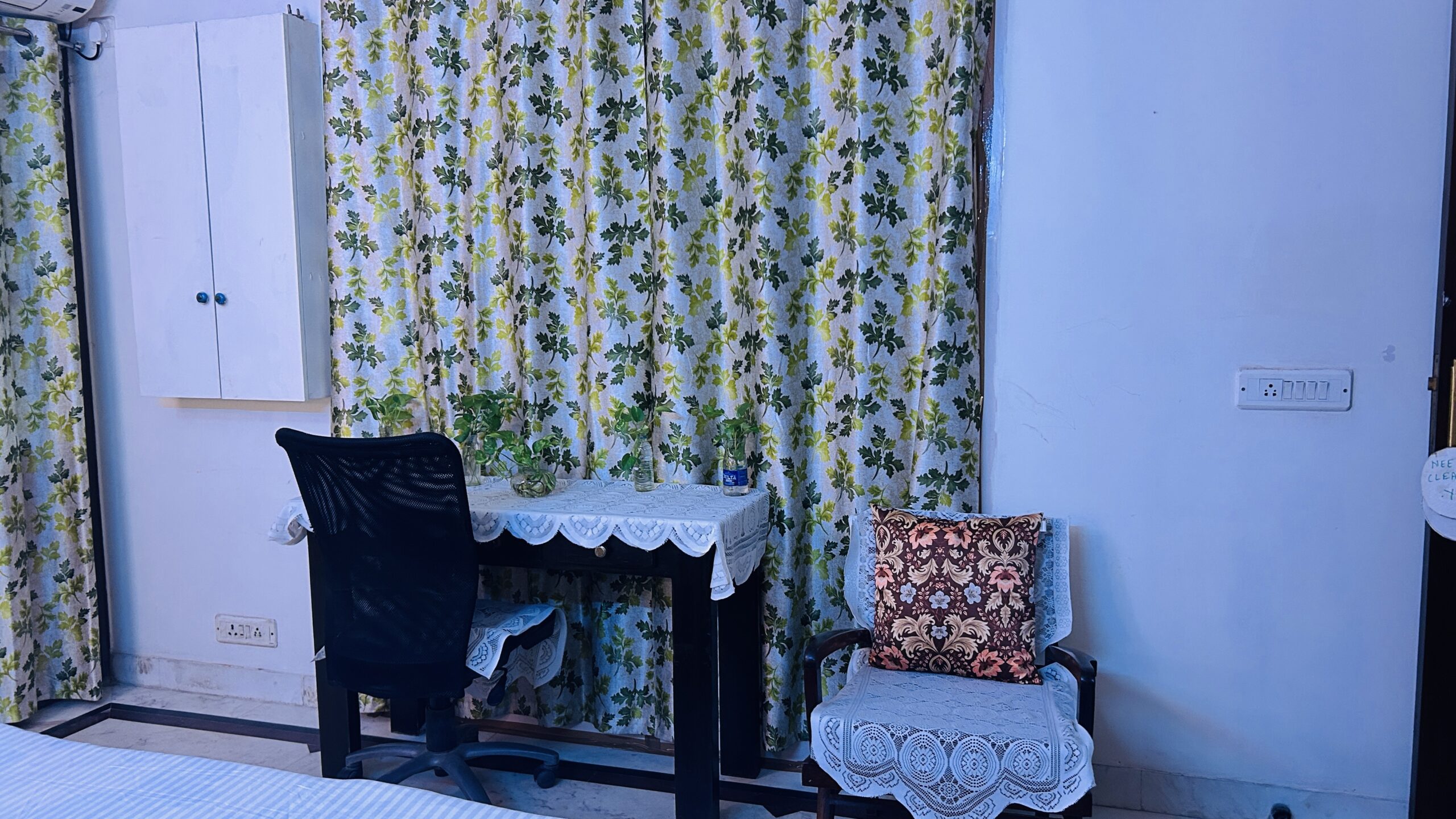 Further, this room has large windows that Room overlooks the majestic Aurobindo compound that offers acres of green view, across the main entry road to the colony.