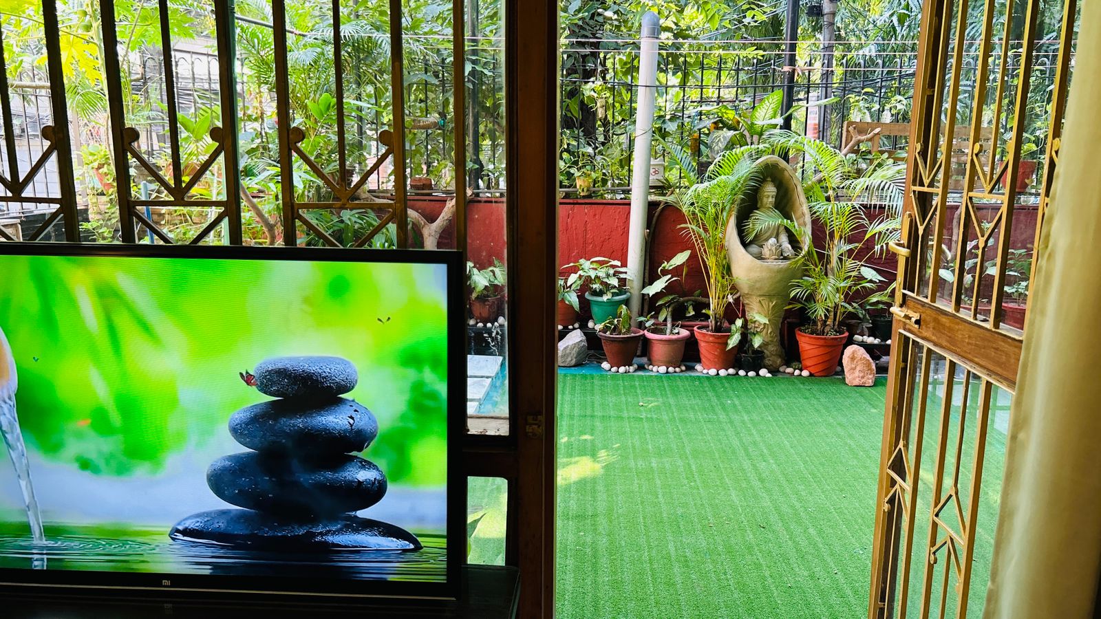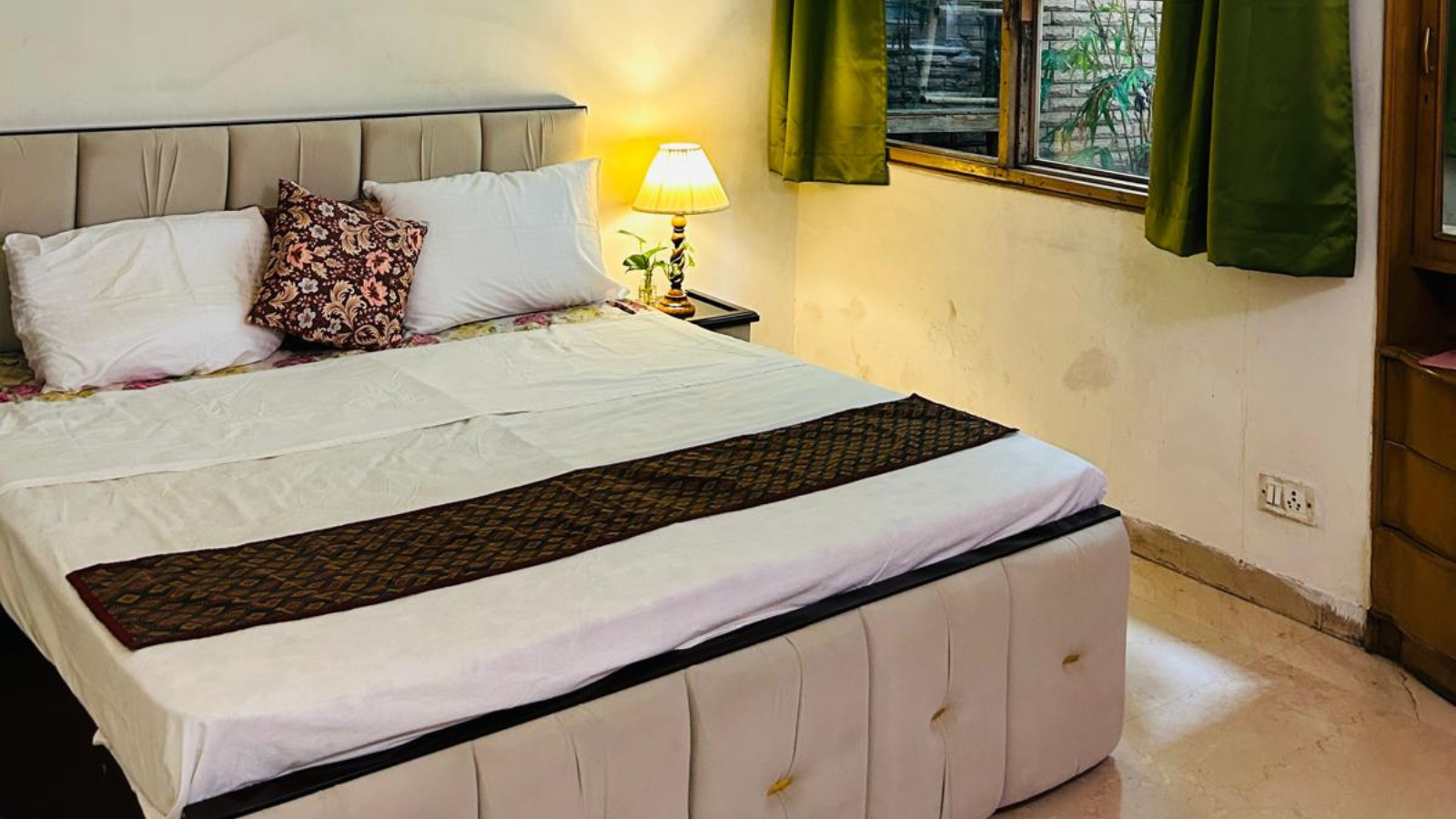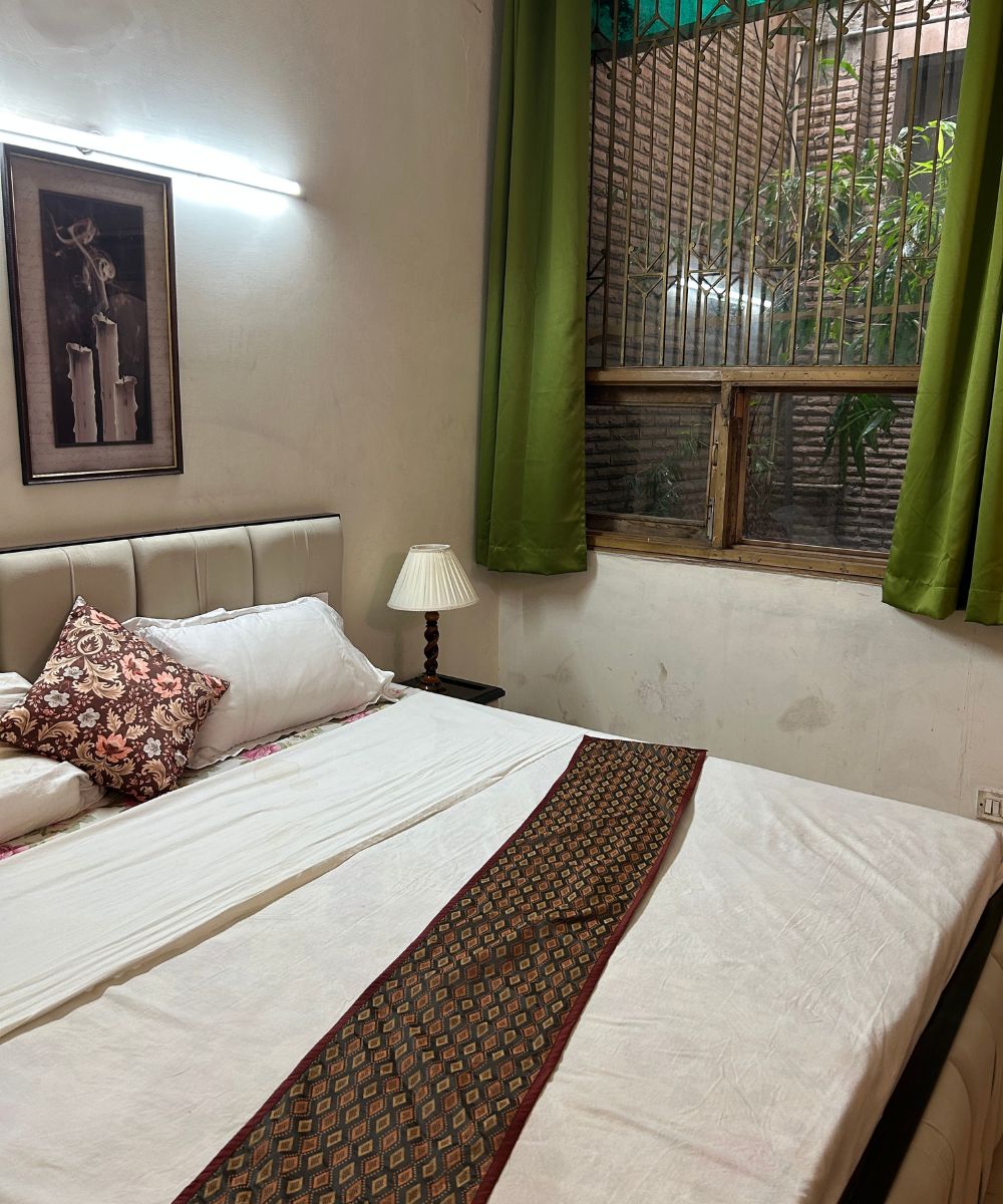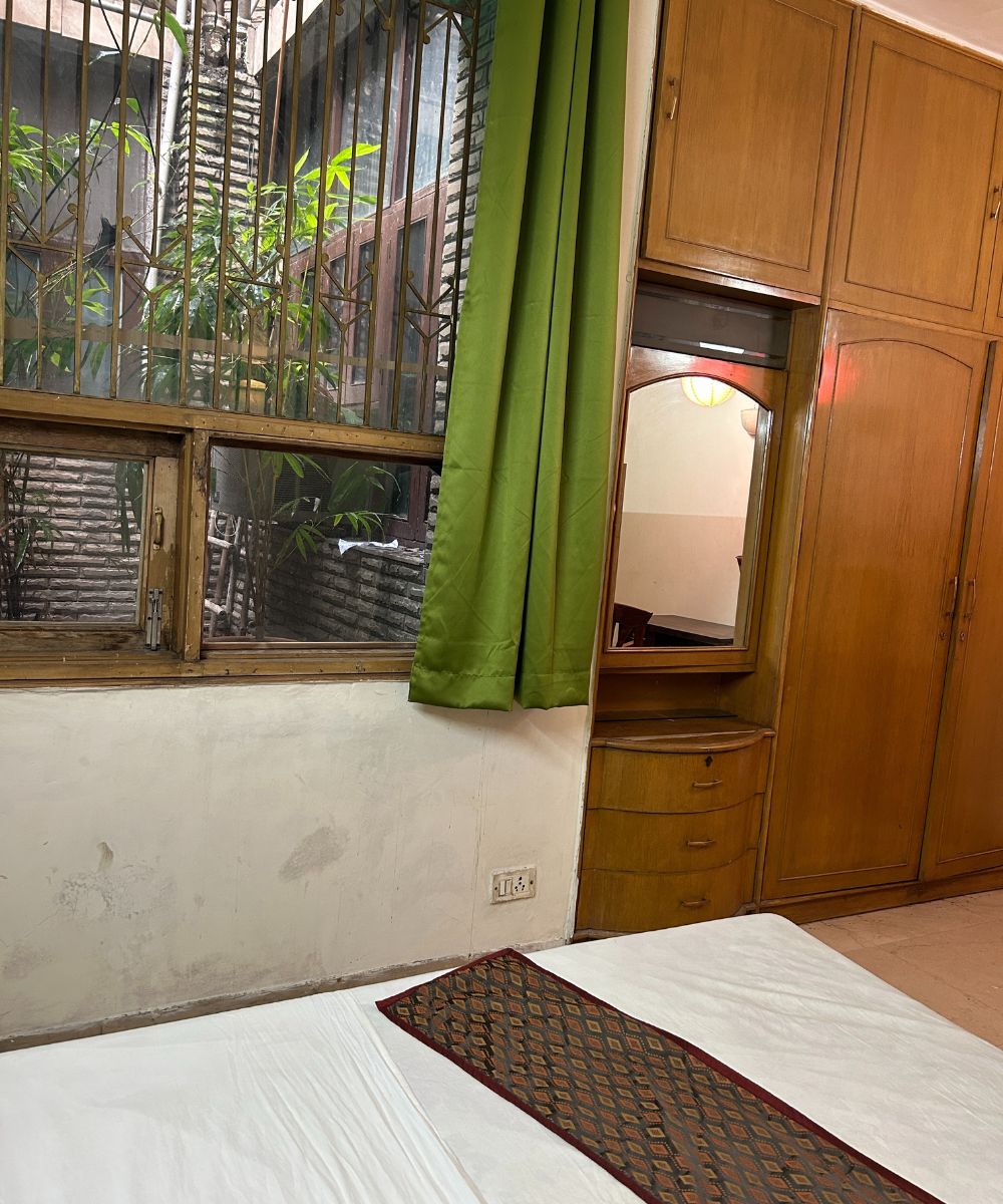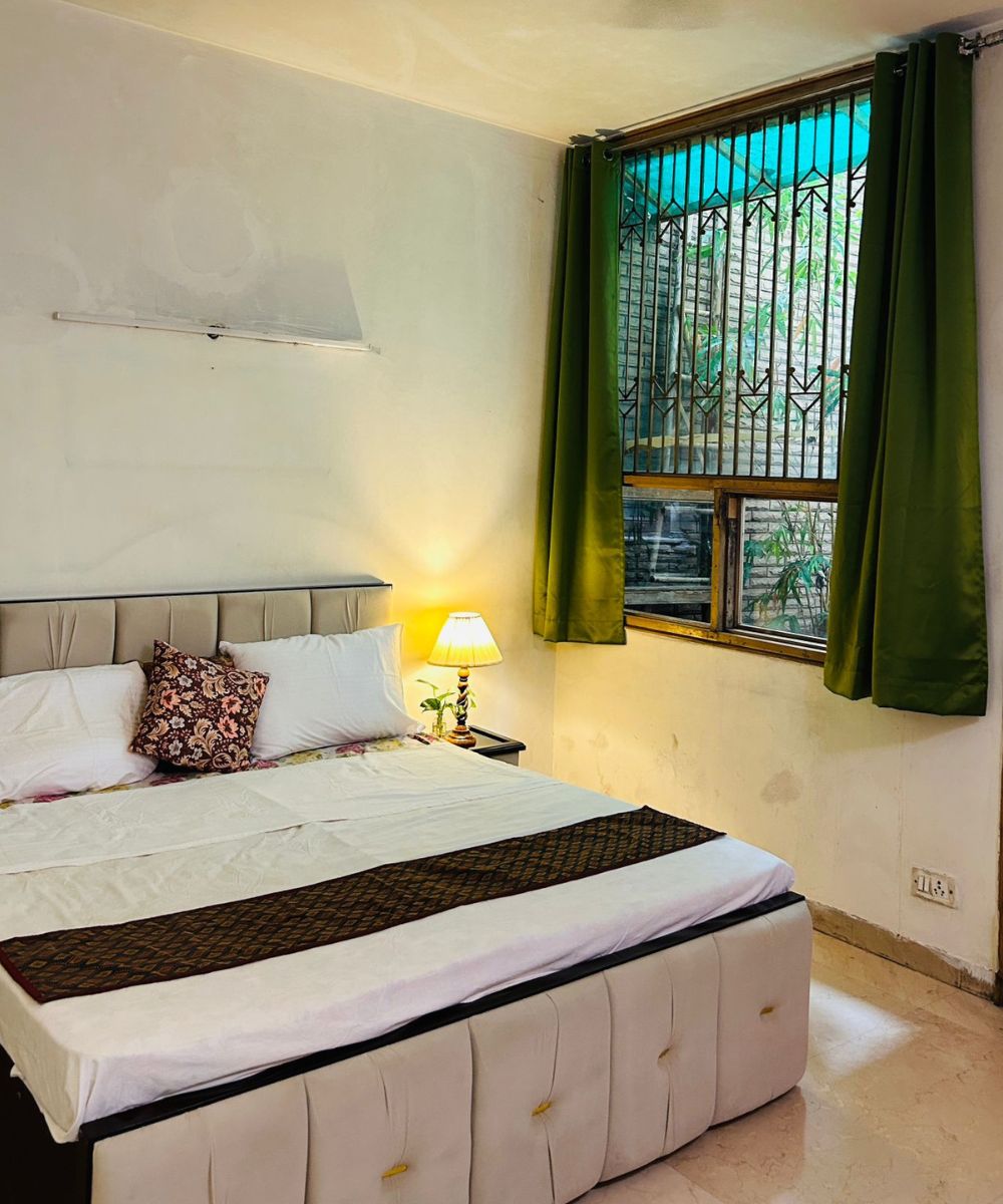 The Vishnu Room spans 200 sq. ft. and offers a serene atmosphere designed for peace and comfort. With its separate entrance, the room ensures privacy and ease of access. A unique highlight is its view of the bamboo-filled shaft, creating a natural, calming backdrop. The room opens directly into a spacious hall ideal for relaxation and meditation, making it a perfect retreat for unwinding, inner reflection, or quiet gatherings.