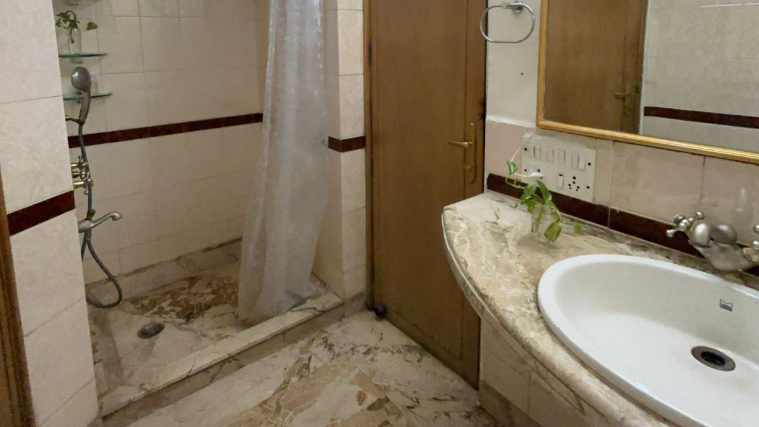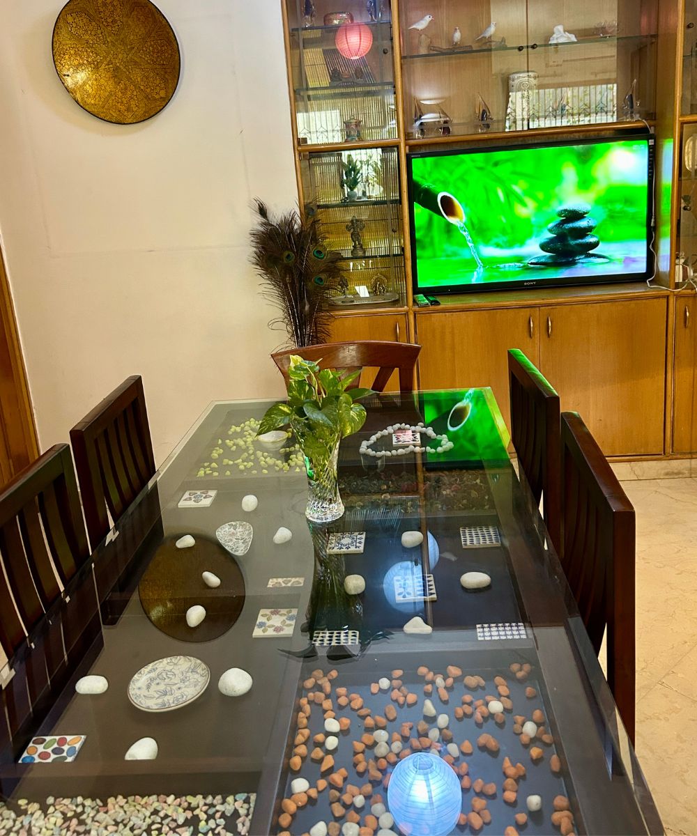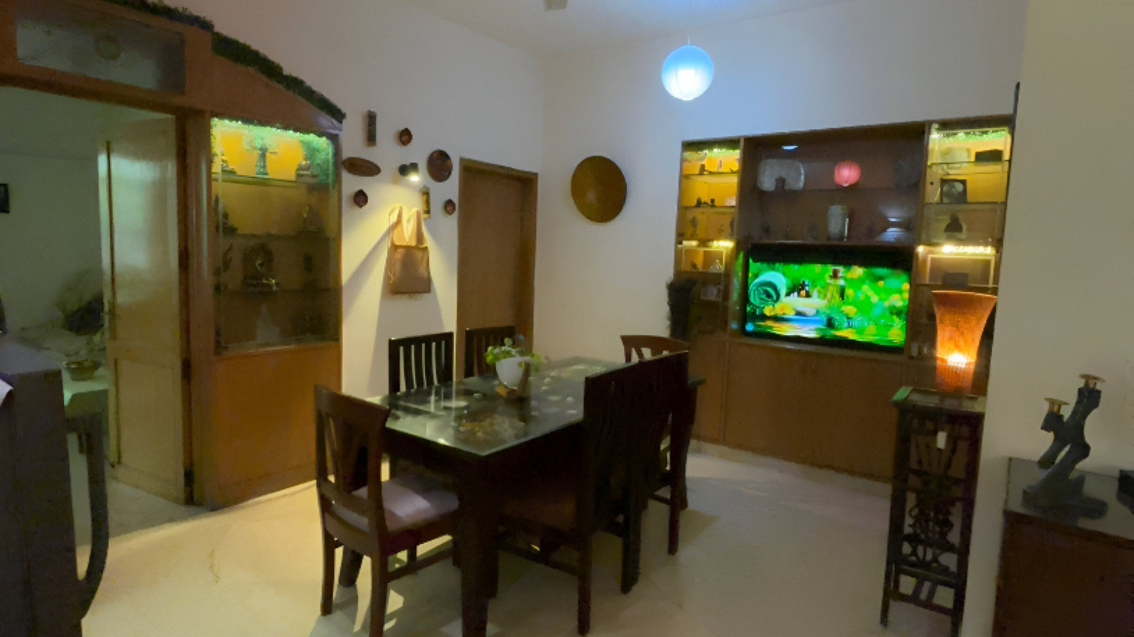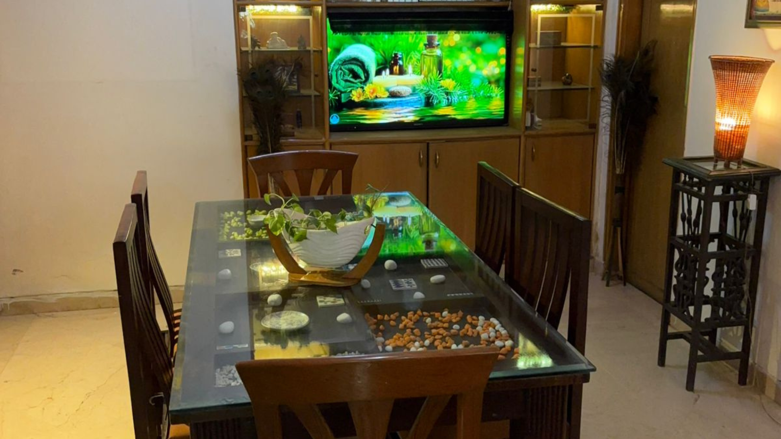 The Vishnu Room spans 200 sq. ft. and offers a serene atmosphere designed for peace and comfort. With its separate entrance, the room ensures privacy and ease of access. A unique highlight is its view of the bamboo-filled shaft, creating a natural, calming backdrop. The room opens directly into a spacious hall ideal for relaxation and meditation, making it a perfect retreat for unwinding, inner reflection, or quiet gatherings.